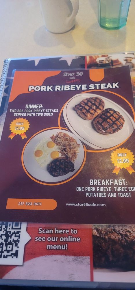 Star 66 Cafe, located at 3752 Camp Butler Rd in Springfield, IL, is a hidden gem offering a delightful mix of comfort food and friendly service. The menu features classic American diner favorites, including hearty breakfasts, delicious sandwiches, and satisfying entrees. From their Breakfast Feast Special to their Tex Mex Skillet, the dishes are flavorful and abundant. Customers rave about the quality of food and the attentiveness of the staff. Whether you're in the mood for a stack of pancakes, a juicy burger, or a comforting plate of meatloaf, Star 66 Cafe delivers on taste and quality. Don't let its gas station location fool you, this 24-hour diner-style restaurant is a must-try for those looking for a satisfying meal in a cozy atmosphere.